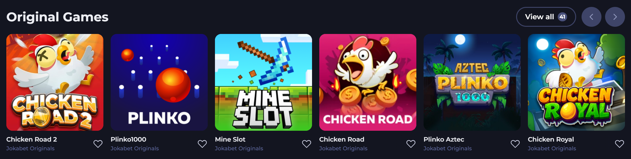 Yes, Jokabet Casino features its own selection of Original games that are exclusive to the platform and not available at other online casinos. The collection includes 40+ unique titles, such as Plinko Aztec, Sugar Daddy, Diver, Plinko1000, Chicken Road, and Mines, offering players something different from standard slot releases.